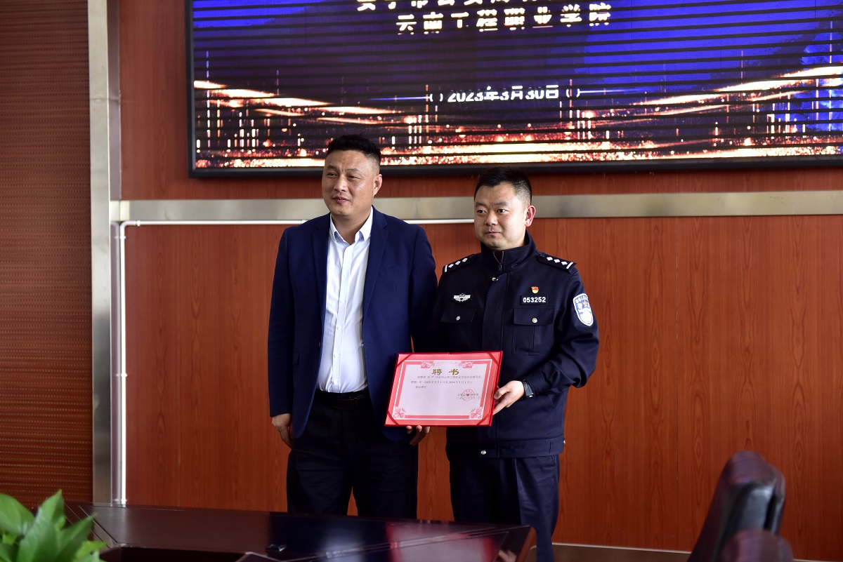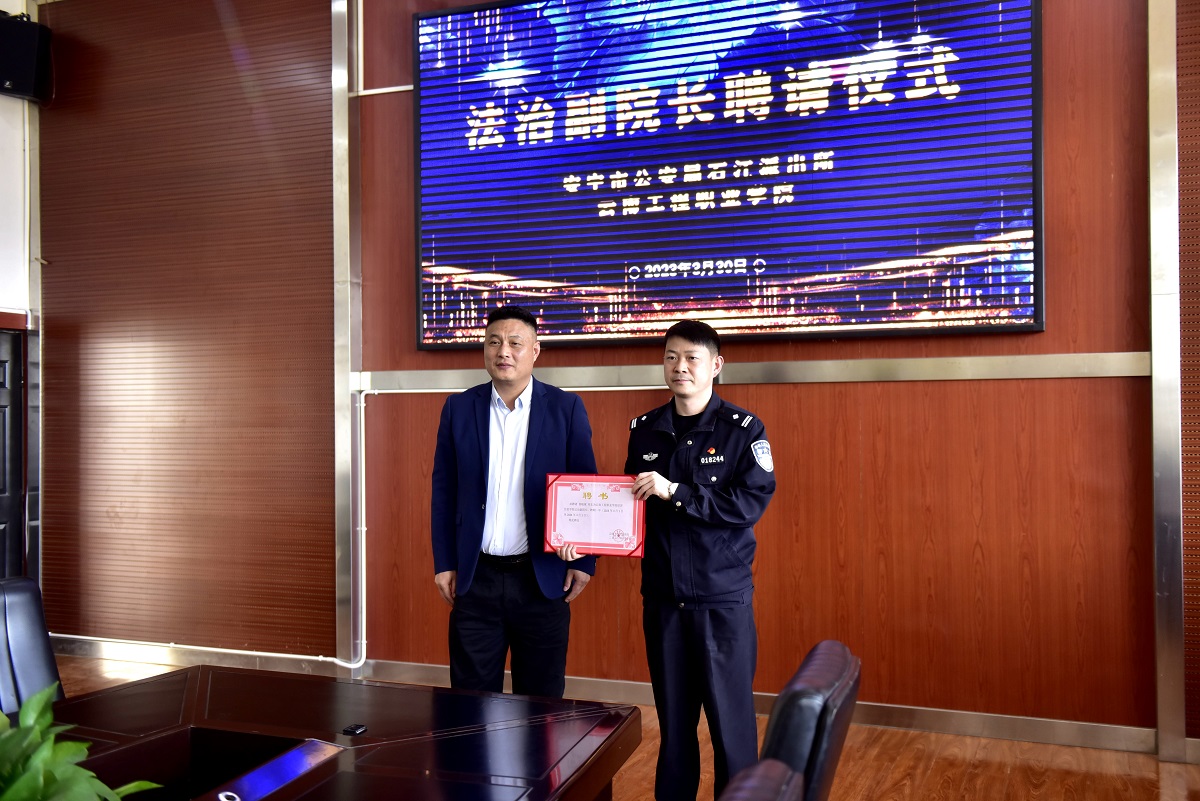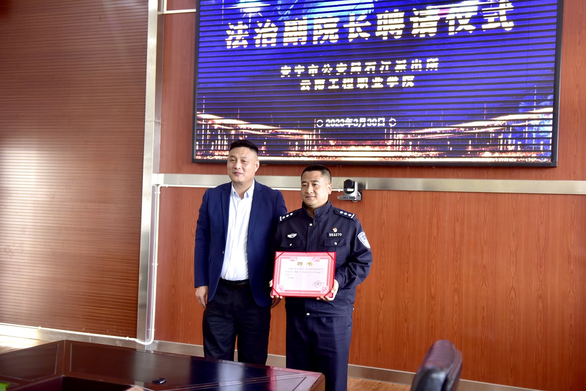 为深入推进依法治校、依法执教,2023年3月30日16:30,我校聘请安宁市公安局石江派出所所长刘严任法治指导员,教导员杨均、副所长吕鹏、片区民警李炜、片区民警袁晓斌任二级学院法治副院长。