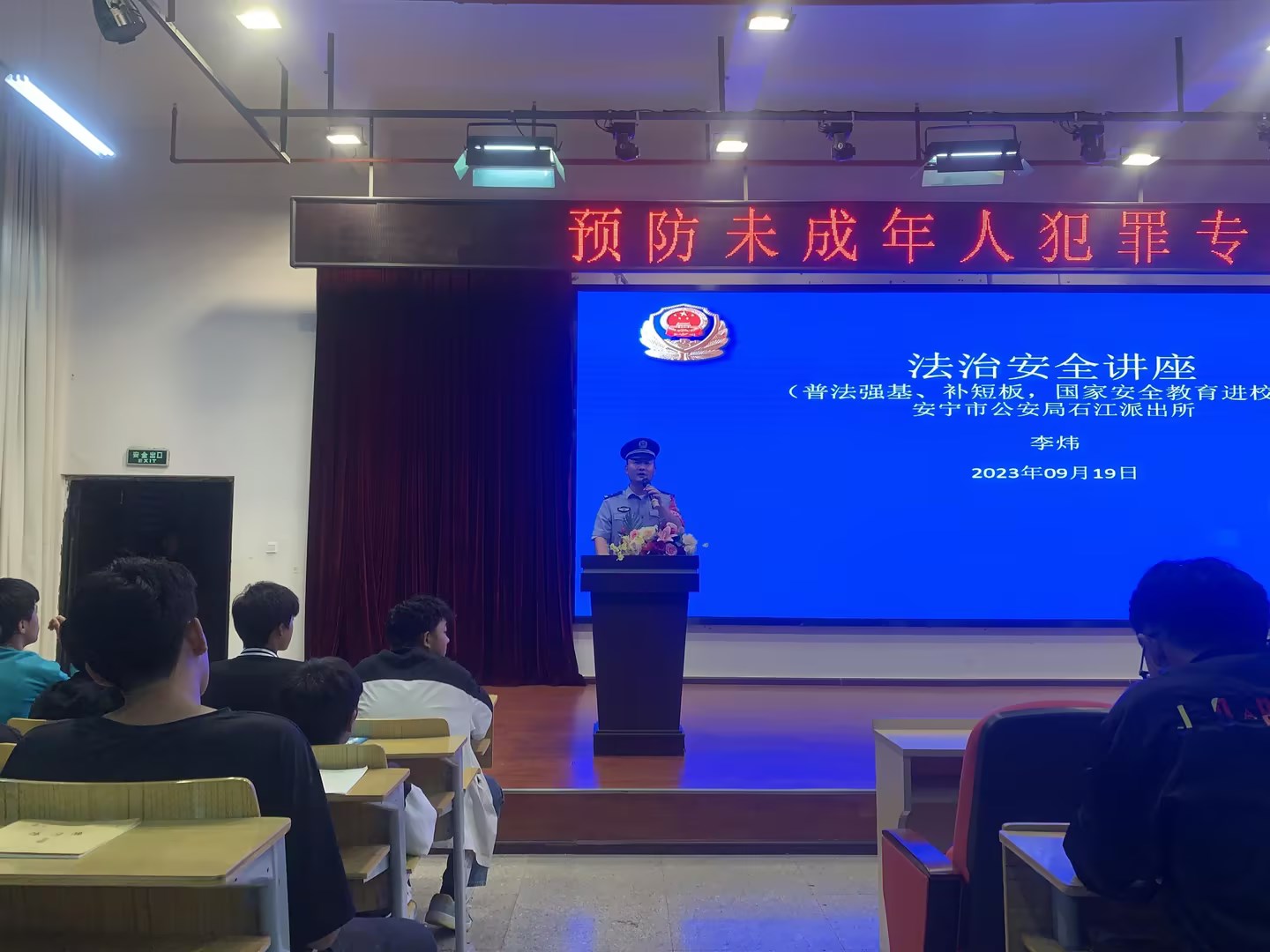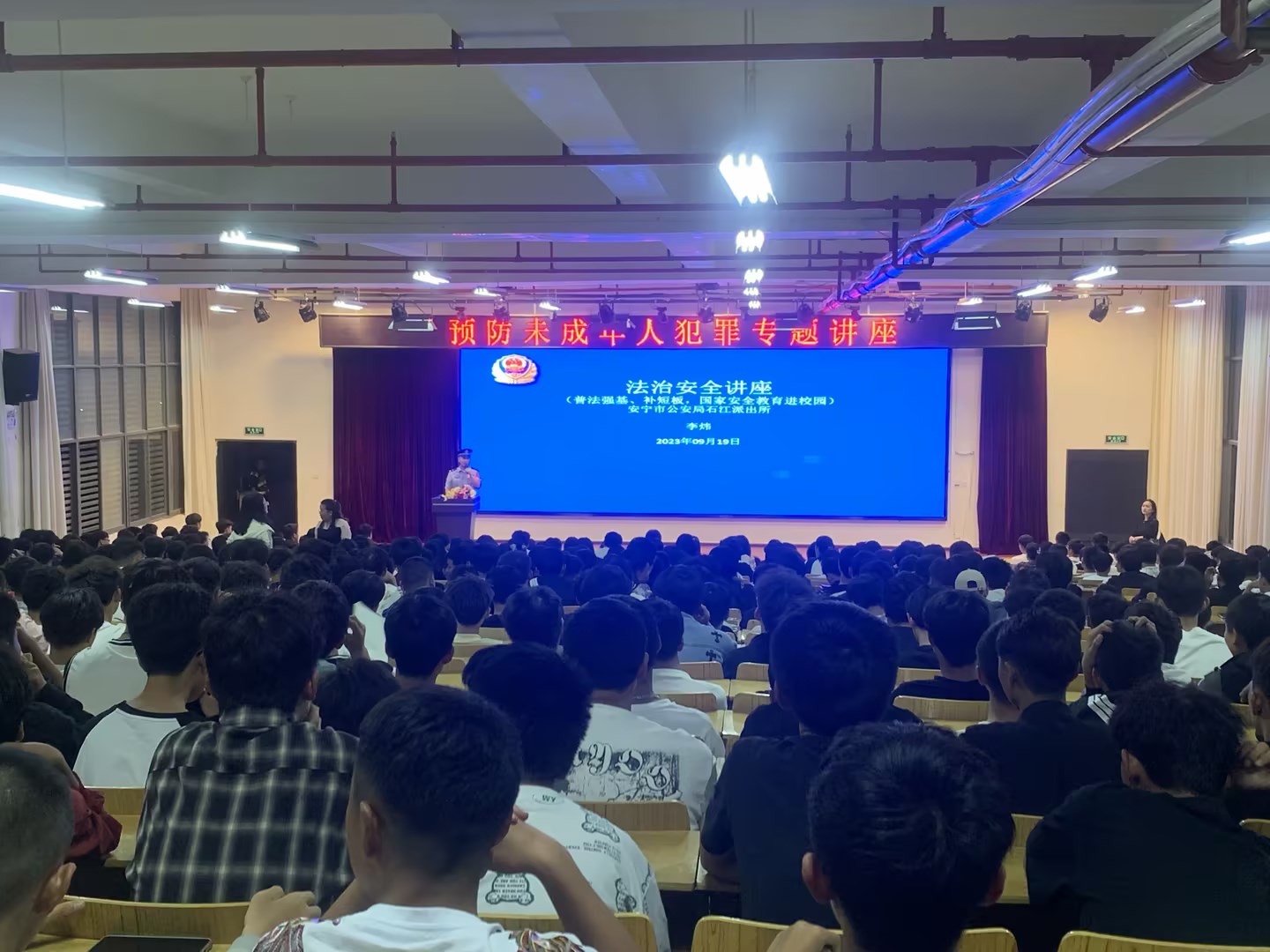 为有效提高未成年学生们的法治意识和自我保护能力,有效预防和减少未成年人违法犯罪,安宁市公安局石江派出所组织片区民警李炜(暨学校法治副院长),于2023年9月19日19:30分许深入云南工程职业学院,开展“普法强基、补短板,国家安全教育进校园”的预防未成年人犯罪专题讲座,共计600余名师生参加。